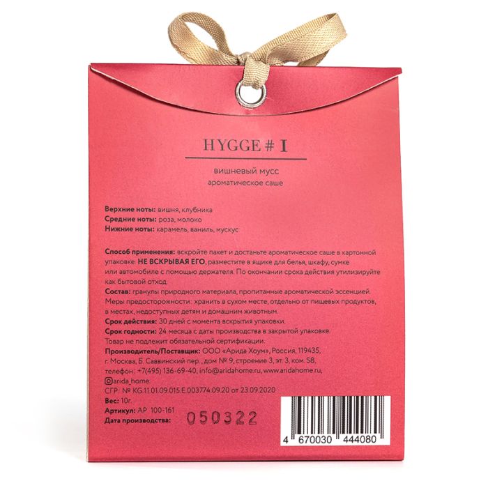 МЫ ПРЕДЛАГАЕМ НОВУЮ ЭКСКЛЮЗИВНУЮ ОПЦИЮ - АРОМАСАШЕ с уникальной коллекцией ароматов HUGGE для дополнительной кастомизации наших рюкзаков. Понятие "Hugge" пришло к нам из Дании и его сложно дословно перевести, но смысл можно передать как "состояние комфорта, уюта, счастья в простых вещах, спокойствия и наслаждения моментом. Добавьте аромасаше коллекции HUGGE пропитанные натуральными ароматическими маслами в наши рюкзаки и неуловимый аромат спокойствия и комфорта будет сопровождать вас целый день окутывая ваши вещи и нейтрализуя неприятные запахи. Модели рюкзаков, в которых есть специальные карманы для аромасаше отмечены на нашем сайте специальным значком AROMA UNI. Вы также можете использовать аромасаше коллекции HUGGE для ароматизации шкафов, одежды, белья, автомобилей. Всегда приятно возвращаться в чистый, красиво пахнущий дом или садиться в автомобиль наполненный роскошным ароматом. НОТЫ АРОМАТА: - Верхние ноты: киви, ревень, розовый перец - Средние ноты: арбуз, цикламен, жасмин - Нижние ноты: лимонное дерево, мускус, сандал СПОСОБ ПРИМЕНЕНИЯ: Вскройте пакет и достаньте ароматическое саше в картонной упаковке. НЕ ВСКРЫВАЯ САШЕ, разместите в ящике для белья, шкафу, сумке или автомобиле с помощью держателя. По окончании срока действия утилизируйте как бытовой отход. Меры предосторожности: хранить в сухом месте, отдельно от пищевых продуктов, в местах недоступных детям и домашним животным. СОСТАВ: Гранулы природного материала, пропитанные ароматической эссенцией СРОК ДЕЙСТВИЯ: 30 дней с момента вскрытия упаковки СРОК ГОДНОСТИ: 24 месяца с даты производства в закрытой упаковке Товар не подлежит обязательной сертификации.