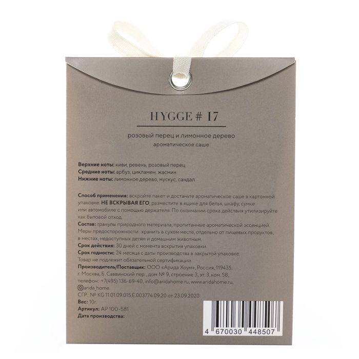 МЫ ПРЕДЛАГАЕМ НОВУЮ ЭКСКЛЮЗИВНУЮ ОПЦИЮ - АРОМАСАШЕ с уникальной коллекцией ароматов HUGGE для дополнительной кастомизации наших рюкзаков. Понятие "Hugge" пришло к нам из Дании и его сложно дословно перевести, но смысл можно передать как "состояние комфорта, уюта, счастья в простых вещах, спокойствия и наслаждения моментом. Добавьте аромасаше коллекции HUGGE пропитанные натуральными ароматическими маслами в наши рюкзаки и неуловимый аромат спокойствия и комфорта будет сопровождать вас целый день окутывая ваши вещи и нейтрализуя неприятные запахи. Модели рюкзаков, в которых есть специальные карманы для аромасаше отмечены на нашем сайте специальным значком AROMA UNI. Вы также можете использовать аромасаше коллекции HUGGE для ароматизации шкафов, одежды, белья, автомобилей. Всегда приятно возвращаться в чистый, красиво пахнущий дом или садиться в автомобиль наполненный роскошным ароматом. НОТЫ АРОМАТА: - Верхние ноты: киви, ревень, розовый перец - Средние ноты: арбуз, цикламен, жасмин - Нижние ноты: лимонное дерево, мускус, сандал СПОСОБ ПРИМЕНЕНИЯ: Вскройте пакет и достаньте ароматическое саше в картонной упаковке. НЕ ВСКРЫВАЯ САШЕ, разместите в ящике для белья, шкафу, сумке или автомобиле с помощью держателя. По окончании срока действия утилизируйте как бытовой отход. Меры предосторожности: хранить в сухом месте, отдельно от пищевых продуктов, в местах недоступных детям и домашним животным. СОСТАВ: Гранулы природного материала, пропитанные ароматической эссенцией СРОК ДЕЙСТВИЯ: 30 дней с момента вскрытия упаковки СРОК ГОДНОСТИ: 24 месяца с даты производства в закрытой упаковке Товар не подлежит обязательной сертификации.