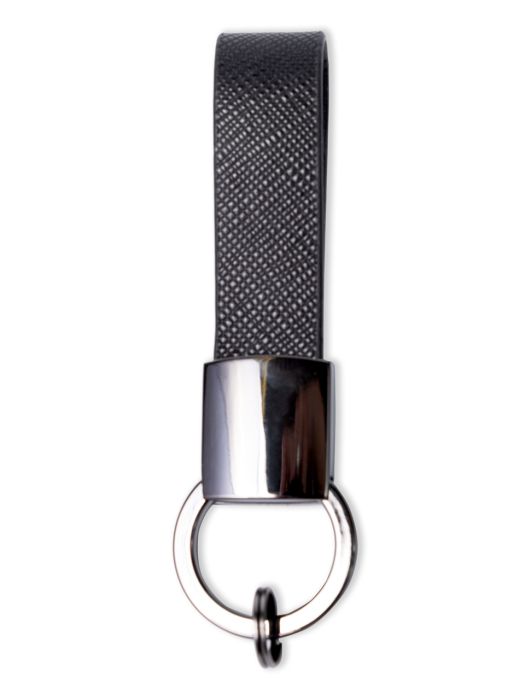 Брелок кожаный в подарочной упаковке "Miles" - Стильный брелок из черной фактурной кожи. Металлическая фурнитура выполнена из металла в черном оттенке с глянцевым покрытием. Удобный механизм включает раздвижное кольцо и одно дополнительное малое кольцо для ключей.