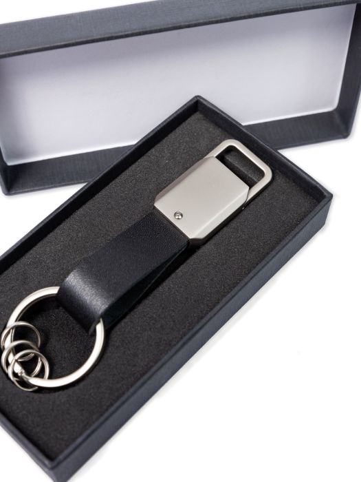 Брелок кожаный в подарочной упаковке "Sylvester" – выполнен из натуральной телячьей кожи насыщенного с металлической фурнитурой матового серебристого покрытия. Практичный поворотный карабин, с одной стороны, обеспечивает удобное крепление к поясной петле или сумке. С другой стороны расположено основное кольцо с тремя раздвижными колечками для упорядочивания ключей.