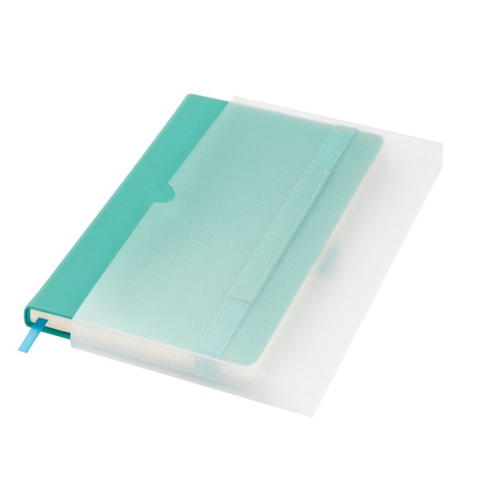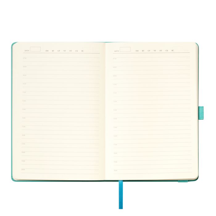 Недатированный ежедневник в нежной, светлой, но при этом лаконичной и динамичной тональности. Имеет современный энергичный облик. Обложка жесткая, гладкая, из матовой искусственной кожи, со скругленными уголками. Покрытие Soft Touch с эффектом легкой пудры функциональное и износоустойчивое. Не блестит. Цвет обложки – бирюзовый, нежный, насыщенный. Его гармонично оттеняют серые матовые форзац и нахзац. Страницы светло-кремовые, гладкие, с легкой шелковистостью, комфортны в работе. Имеют скругленные уголки. Срез матовый, в тон страниц. Ляссе одинарное, атласное, голубого цвета. Ширина 6 мм. Материал ляссе гладкий, шелковистый, с легким блеском. Изделие дополнено плотной, надежной, голубой резинкой-фиксатором. Она украшена прямоугольным фрагментом из материала обложки с прошивкой в тон по периметру. Голубая петелька для ручки компактная и удобная.