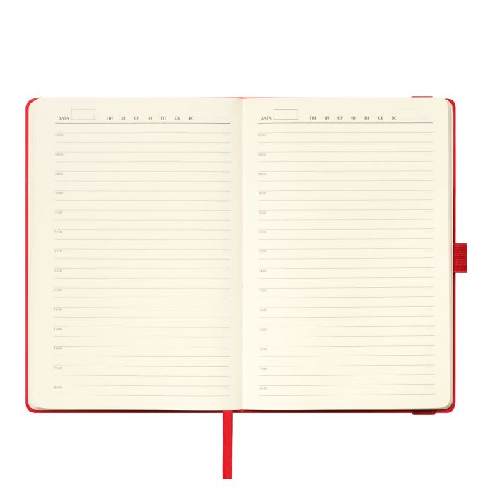 Недатированный ежедневник в ярком цвете. Обложка жесткая, гладкая, матовая, из искусственной кожи, со скругленными уголками. Поверхность переплетного материала – Soft Touch – с легким эффектом пудры, износоустойчивая. Салатовые матовые форзац и нахзац создают удачное контрастное сочетание с цветом обложки. Страницы теплого приятного светлого-кремового цвета, гладкие, с легкой шелковистостью и со скругленными уголками. Срез матовый, в тон страниц. Ляссе одинарное, атласное, в тон обложки. Тактильно шелковистое, с легким блеском. Вертикальная фиксирующая резинка плотная, надежная, в тон обложки. Декорирована прямоугольным фрагментом из материала обложки с прошивкой по периметру в тон. Есть петелька для ручки в тон резинки. Упаковка: пластиковая коробка