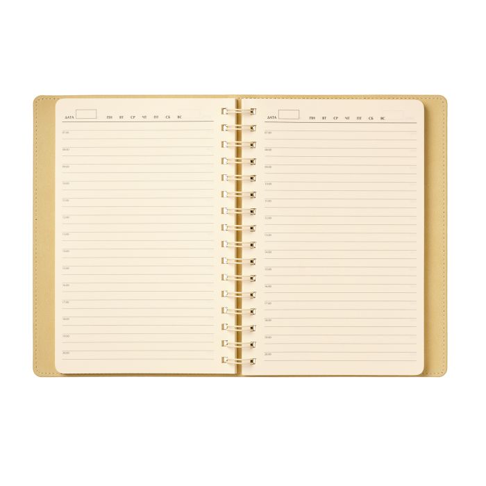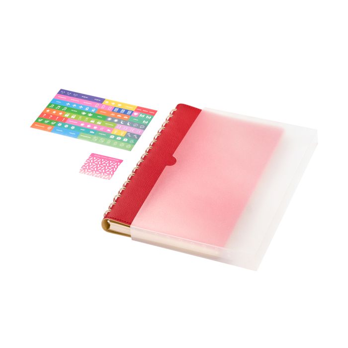 Недатированный ежедневник в гибкой обложке со скругленными уголками из искусственной кожи. Обложка выполнена из сшивки двух материалов. Внешний материал обложки матовый, с некрупным рельефом под натуральную кожу. Цвет – яркий красный, однородный. Внутренний материал обложки – Latte – бархатистый, мелкозернистый, однородного светло-бежевого цвета. По периметру обложки выполнена прошивка в тон. Форзац и нахзац контрастные, бежевые. Теплые кремовые страницы со скругленными уголками выполнены из гладкого шелковистого офсета. Срез матовый, в тон страниц. Ежедневник надежно скреплен полускрытой пружиной в цвет внутреннего материала обложки. Изделие комплектуется вкладышем с цветными стикерами и индивидуальной упаковкой.