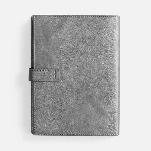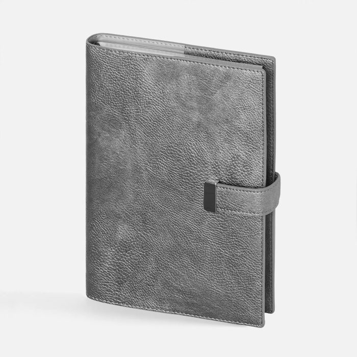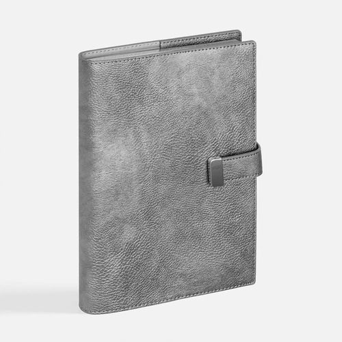 Ежедневник в мягком переплёте со съёмная обложкой, дополнен застёжкой-хлястиком с металлическим шильдом на кнопке, двойным ляссе и капталом.