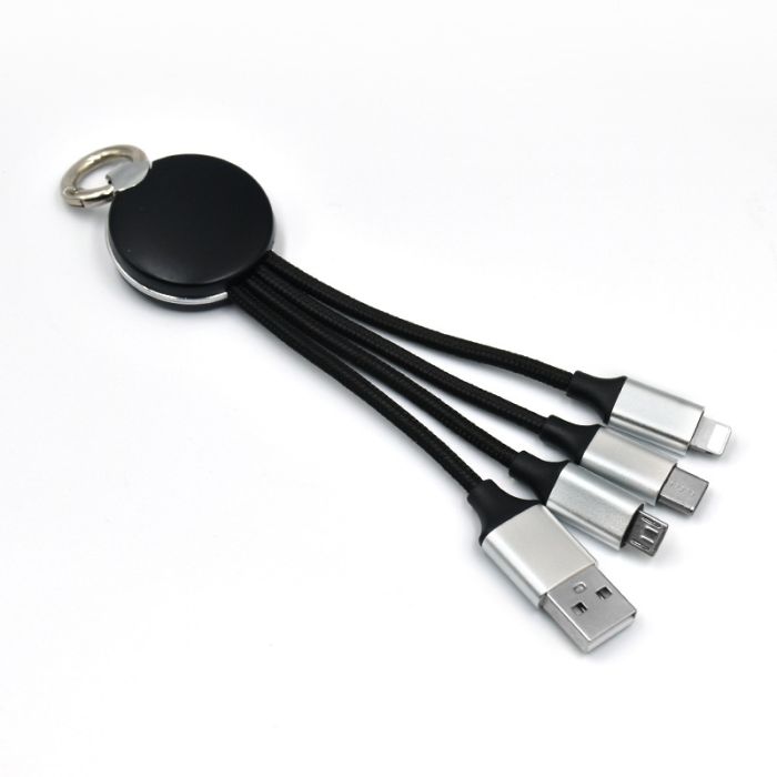 Кабель для зарядки 3 в 1 "Jessie", черный с брелоком и коннекторами: Type С, USB type A, Micro USB и Lightning - отличное решение если у вас есть несколько устройств и вы ищете оптимальное решение для их зарядки.