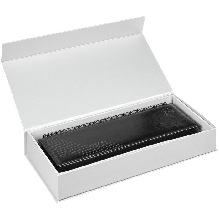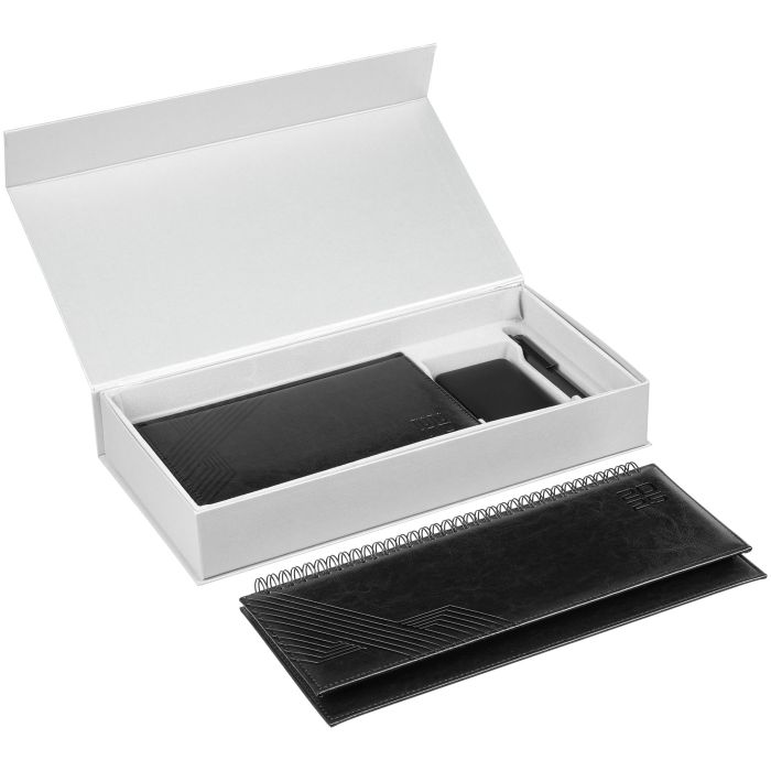 Внешний аккумулятор Uniscend Full Feel Type-C, 5000 мАч, чёрный - Ежедневник Faro, датированный, А5, чёрный - Планинг Faro, датированный, чёрный - Коробка Planning, серебристая - Ложемент под планинг, ежедневник, ручку, визитницу - Ручка шариковая Prodir DS4 PMM-P, чёрная