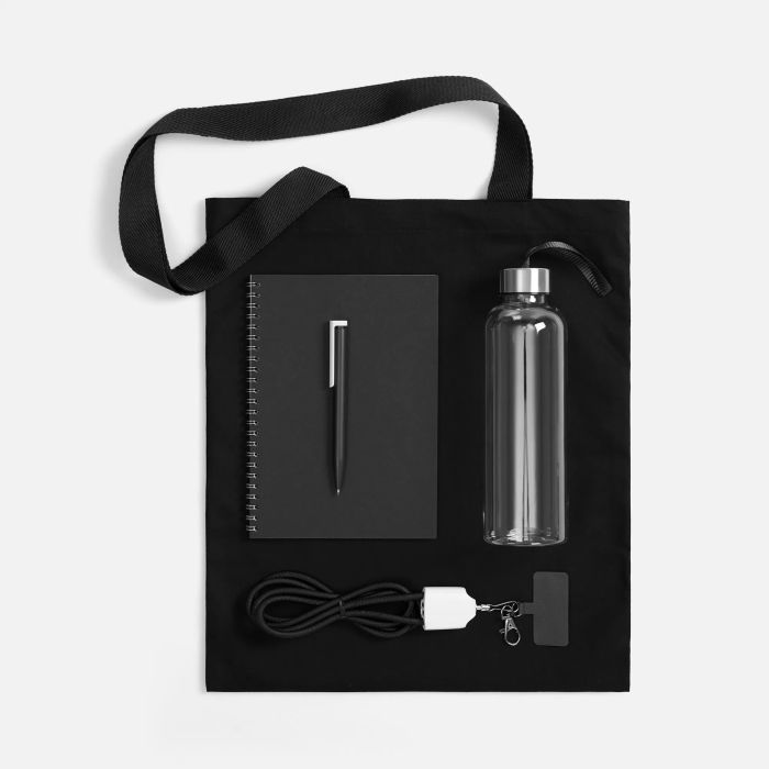 С продуманным приветственным набором Flowork получится быть в потоке с первого рабочего дня: своевременно выполнять все задачи и пополнять как свой водный баланс, так и уровень заряда основных электронных устройств. А значит — быстро адаптироваться на новом месте и с лёгкостью войти в общий ритм. Элементы с яркими цветовыми акцентами добавляют стиля этому велком-паку, собранному в трендовый прочный шопер. Ёмкость бутылки 500 мл. В комплекте: - Холщовая сумка BrighTone, чёрная с чёрными ручками - Кабель-ланьярд energyFlex Pro, чёрный - Бутылка Gulp, чёрный - Блокнот Salvador в клетку, чёрный ver.2 - Ручка шариковая Dotto, чёрный
