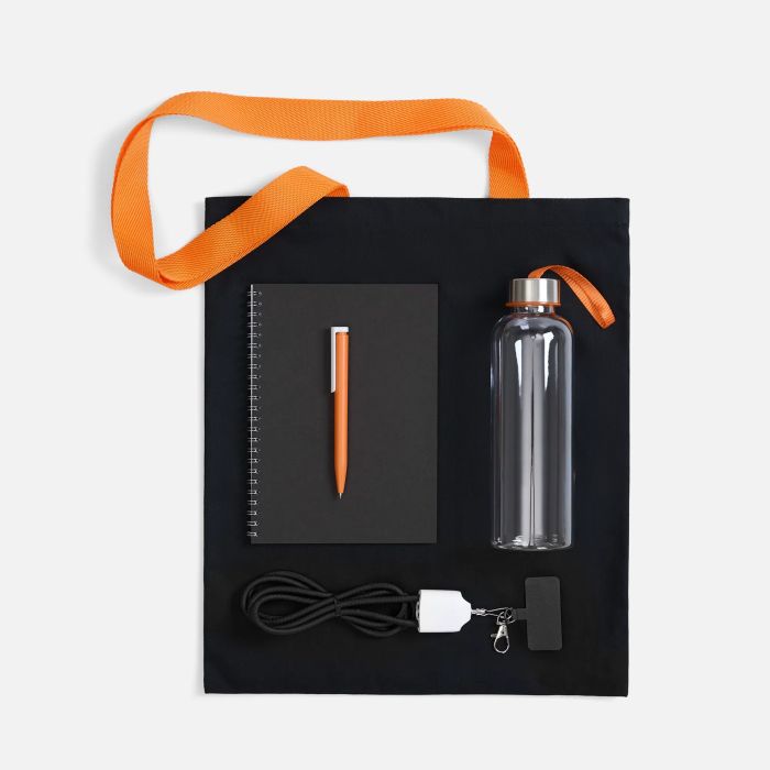С продуманным приветственным набором Flowork получится быть в потоке с первого рабочего дня: своевременно выполнять все задачи и пополнять как свой водный баланс, так и уровень заряда основных электронных устройств. А значит — быстро адаптироваться на новом месте и с лёгкостью войти в общий ритм. Элементы с яркими цветовыми акцентами добавляют стиля этому велком-паку, собранному в трендовый прочный шопер. Ёмкость бутылки 500 мл. В комплекте: - Холщовая сумка BrighTone, чёрная с оранжевый - Кабель-ланьярд energyFlex Pro, оранжевый - Бутылка Gulp, оранжевый - Блокнот Salvador в клетку, чёрный ver.2 - Ручка шариковая Dotto, оранжевый