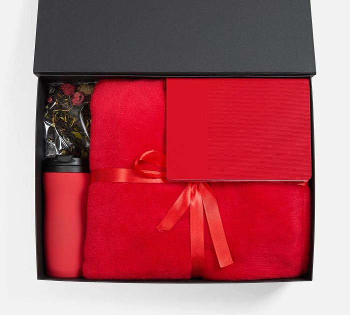 В комплекте: - Коробка Koffer - Плед Plush - Термостакан Forma - Ежедневник Vale New, недатированный - Чай черный «Сила Сибири»