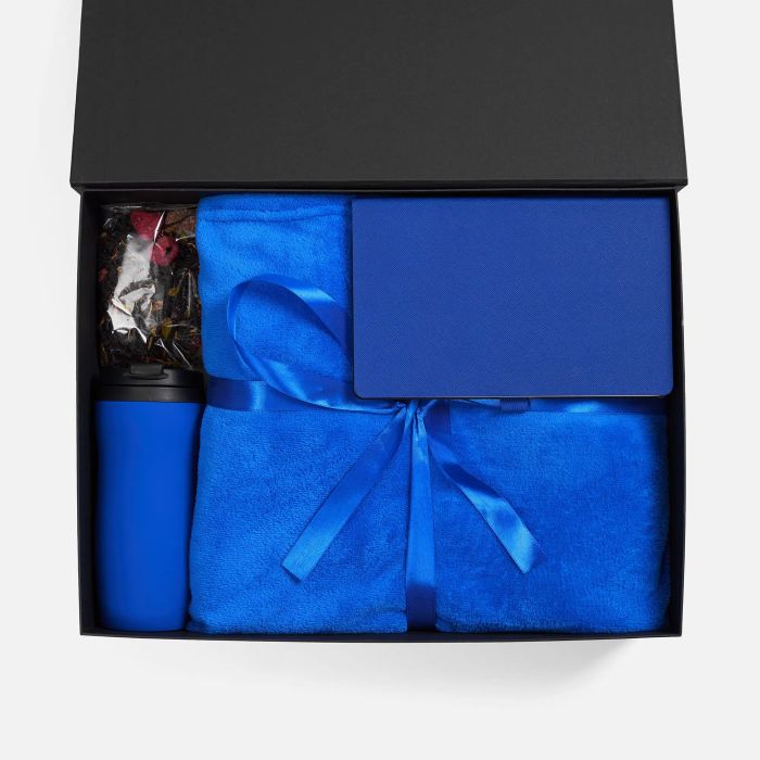 В комплекте: - Коробка Koffer - Плед Plush - Термостакан Forma - Ежедневник Vale New, недатированный - Чай черный «Сила Сибири»