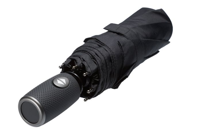 Эргономичная ручка с покрытием soft touch удобно лежит в руке. Зонт складывается в два сложения и поставляется в жестком футляре на молнии.